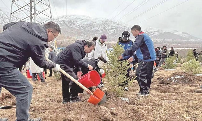 清晨,一场春雪悄然飘落,玉树市远处群山银装素裹。10时,植树现场一派热火朝天的景象。在玉树市南山片区主会场,机关干部、政法干警、驻军部队、学校师生、生态管护员、志愿者分工协作、默契配合,挖坑、扶苗、培土、浇水,每道工序细致规范,一株株云杉、丁香、榆叶梅扎根坡地,为高原大地增添生机。