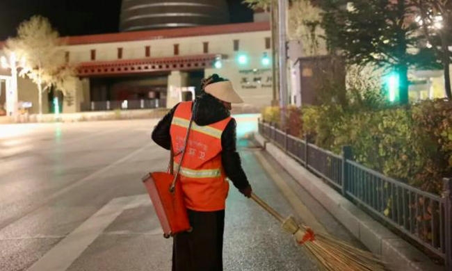 凌晨三点的玉树,夜色未褪、寒风凛冽,环卫工人已身着工装踏上街头。按照“分区负责、定岗定责”要求,他们分散在各条路段,扫帚与地面的摩擦声打破静谧,落叶、杂物被逐一清理,就连石缝里的细小纸屑也不放过。“多扫一寸,城市就干净一分。”无人言说的信念里,一条条整洁街道在晨光微露时渐次舒展。