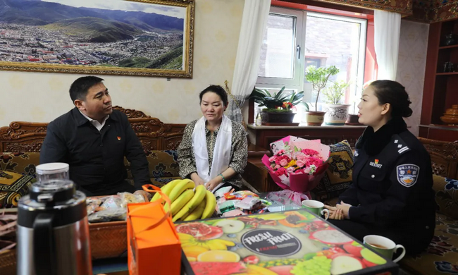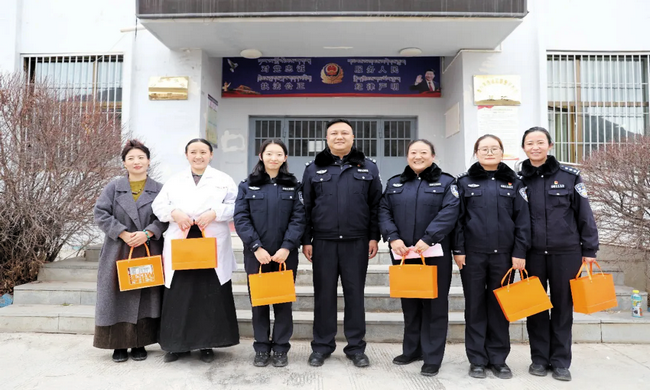 (挂职)锻炼干部扎西曲江,局党委委员索南求措深入局机关、基层派出所,索昂多丁副局长前往监管所、环食药侦查大队,其他班子成员按分工深入分管各部门,为一线女民辅村警、工勤人员送上慰问品与节日祝福,向坚守岗位、履职奉献的巾帼女警致以诚挚问候。